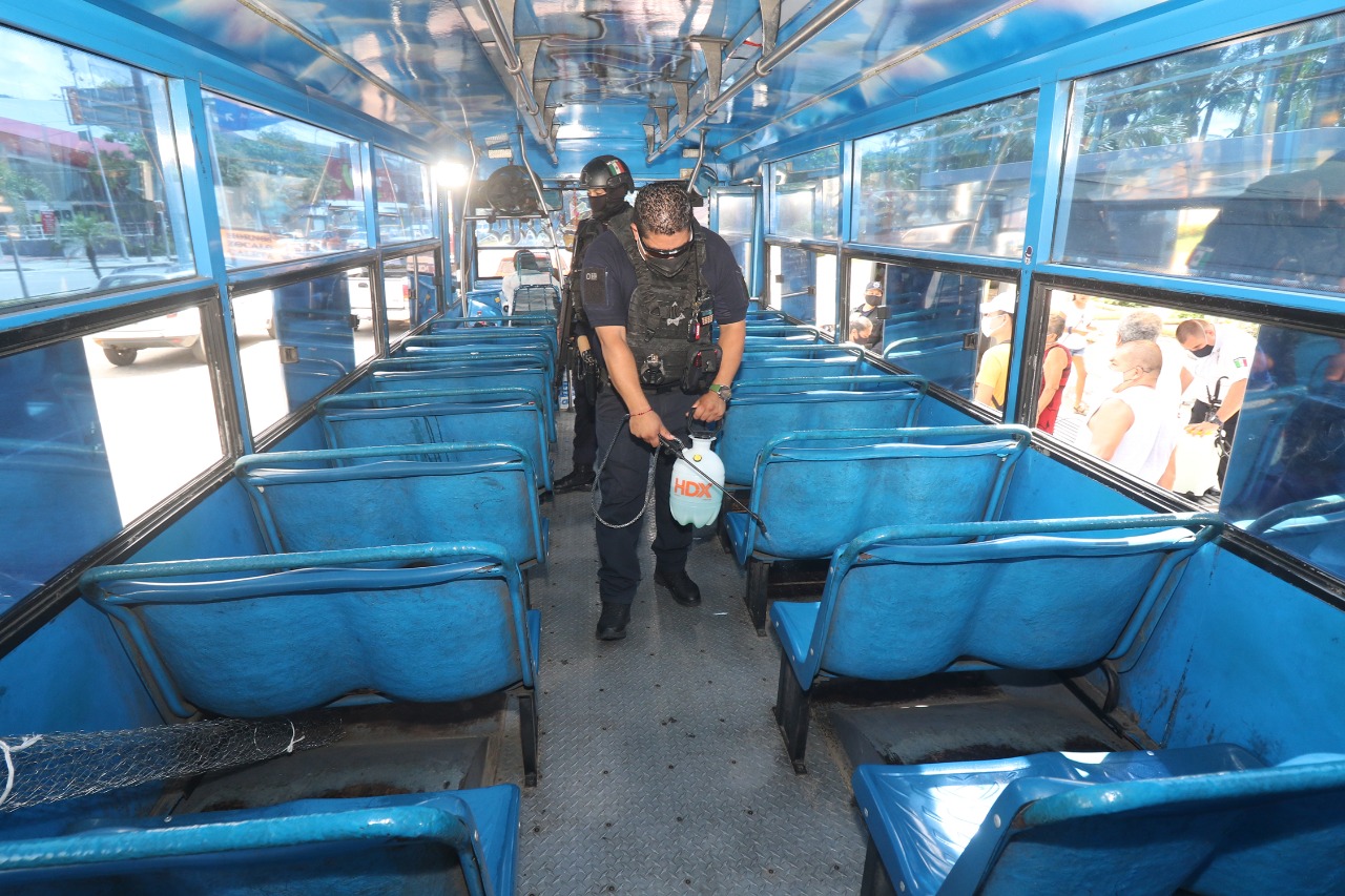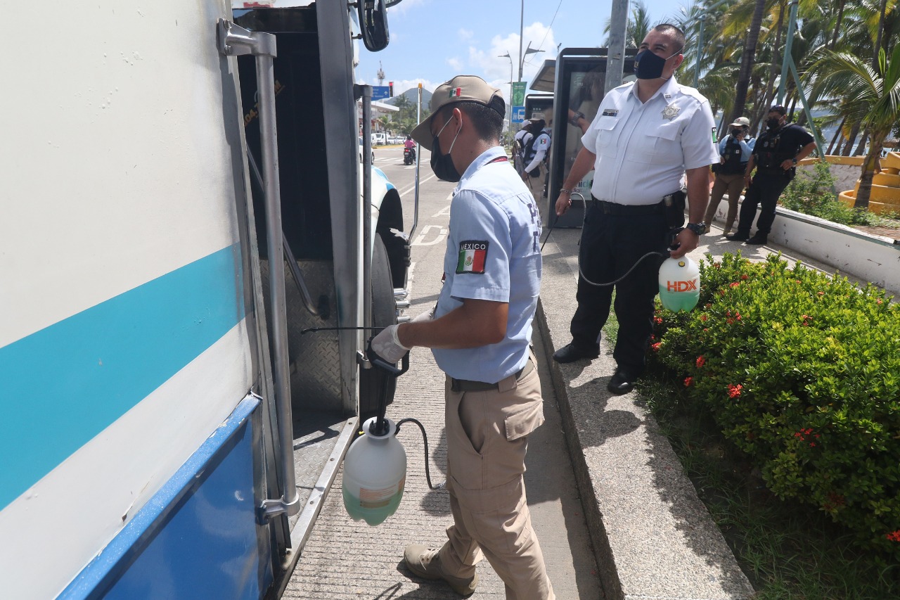Durante los operativos efectuados en la Costera Miguel Alemán, elementos de la Policía Vial, Policía Urbana y Policía Turística concientizan a choferes del transporte público, colaboran en la desinfección de unidades y aplican gel antibacterial a los pasajeros.