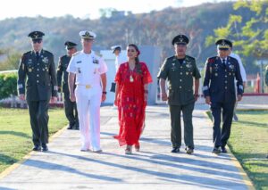 Posteriormente, la titular del Ejecutivo estatal se trasladó al Museo de la Bandera y Santuario de la Patria, acompañada del alcalde de Iguala, Erik Catalán Rendón y mandos de las fuerzas armadas, donde participó en la toma de protesta a escoltas en un acto simultáneo con la presidenta de México.