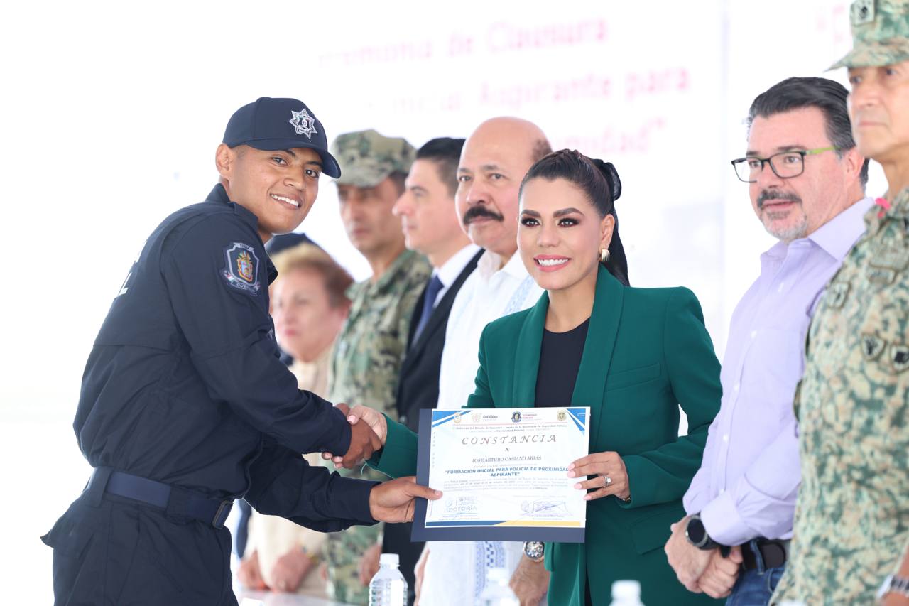 En la ceremonia, Evelyn Salgado entregó de manera simbólica constancias a las y los cadetes egresados de la Universidad Policial, junto con el secretario de Seguridad Pública Estatal, Daniel Antonio Ledesma, quien destacó que estos trabajos de formación policial están alineados a la estrategia Nacional de Seguridad del Gobierno de México.