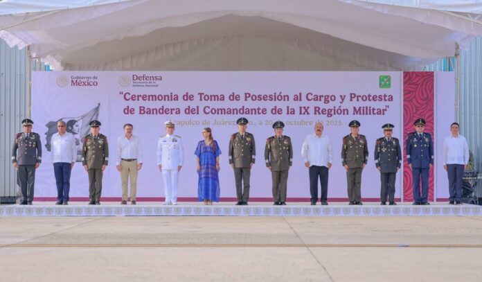 Acapulco, Gro., a 20 de Octubre del 2025.- “Seguimos trabajando hombro con hombro, con lealtad y coordinación, por un Guerrero más seguro, más justo y más próspero. Porque servir a Guerrero es servir a México, y servir a México siempre ha sido, es y será, un acto de amor, de justicia, de lealtad y de entrega al pueblo”, expresó la gobernadora Evelyn Salgado Pineda durante la ceremonia de Toma de Posesión al Cargo y Protesta de Bandera de José Roberto Flores Montes de Oca, como nuevo comandante de la Novena Región Militar.
