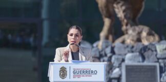 Evelyn Salgado iza bandera monumental del escudo de Guerrero en el...